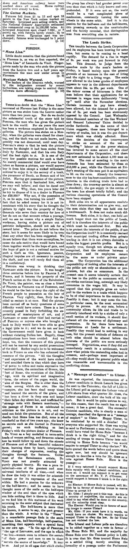There is no doubt that the Mona Lisa recovered at Florence last Friday is the same picture as was stolen from the Louvre rather more than two years ago. Nor do we doubt the substantial truth of the story told by the man who has given the picture back to the world. For six years the man has been a workman employed in the Louvre galleries. The picture was stolen on a Monday, when the galleries were closed for cleaning, and the theft was not made known, and possibly was not discovered, until the next day.